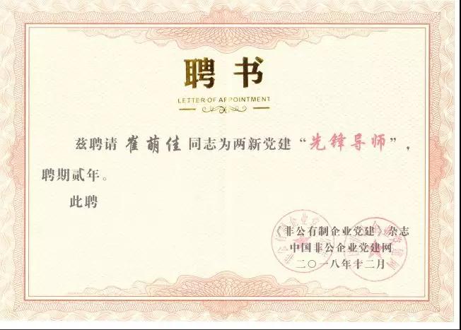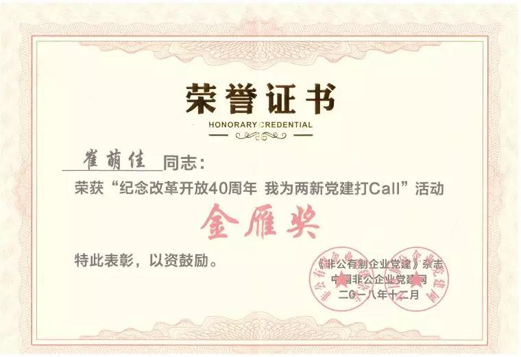 桂林萬禾農(nóng)產(chǎn)品公司黨總支書記崔萌佳被現(xiàn)場授予全國優(yōu)秀兩新組織黨組織書記“金雁獎”殊榮,并被《非公有制企業(yè)黨建》雜志、中國非公企業(yè)黨建網(wǎng)聘任為“先鋒導(dǎo)師”。據(jù)了解,全國共有40位兩新組織黨組織書記獲“金雁獎”榮譽(yù)。