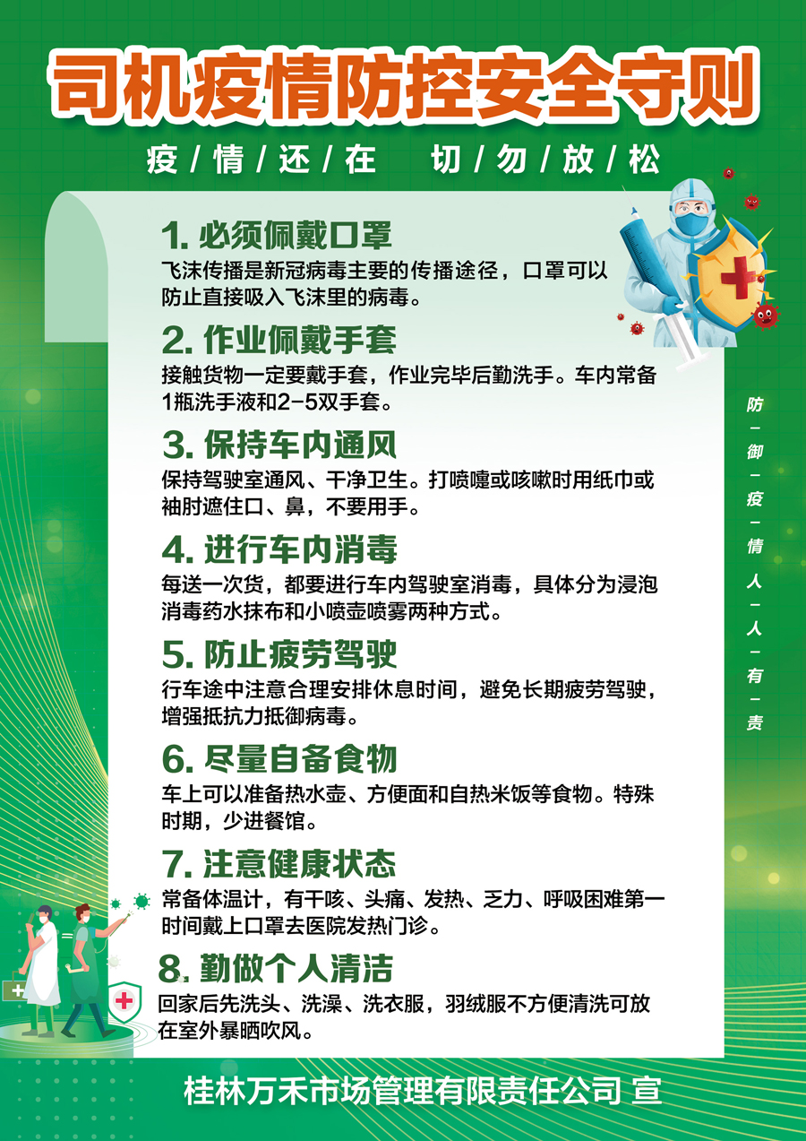 桂林萬禾市場管理有限責任公司對所有進出市場人員嚴格執(zhí)行測體溫及掃碼核對實名制出入制度、戴口罩、強化場所衛(wèi)生清潔及預防性消毒等各項疫情防控工作。禁止中高風險地區(qū)人員及車輛進入市場。全力保障公司員工、群眾的生命安全和身體健康。