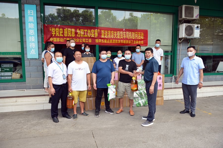 今年8月,由桂林市總工會開展“夏日送清涼”慰問活動,為五里店果蔬批發(fā)市場工會聯(lián)合會會員和貨車司機(jī)送來綠豆等防暑、防高溫暖心物品。