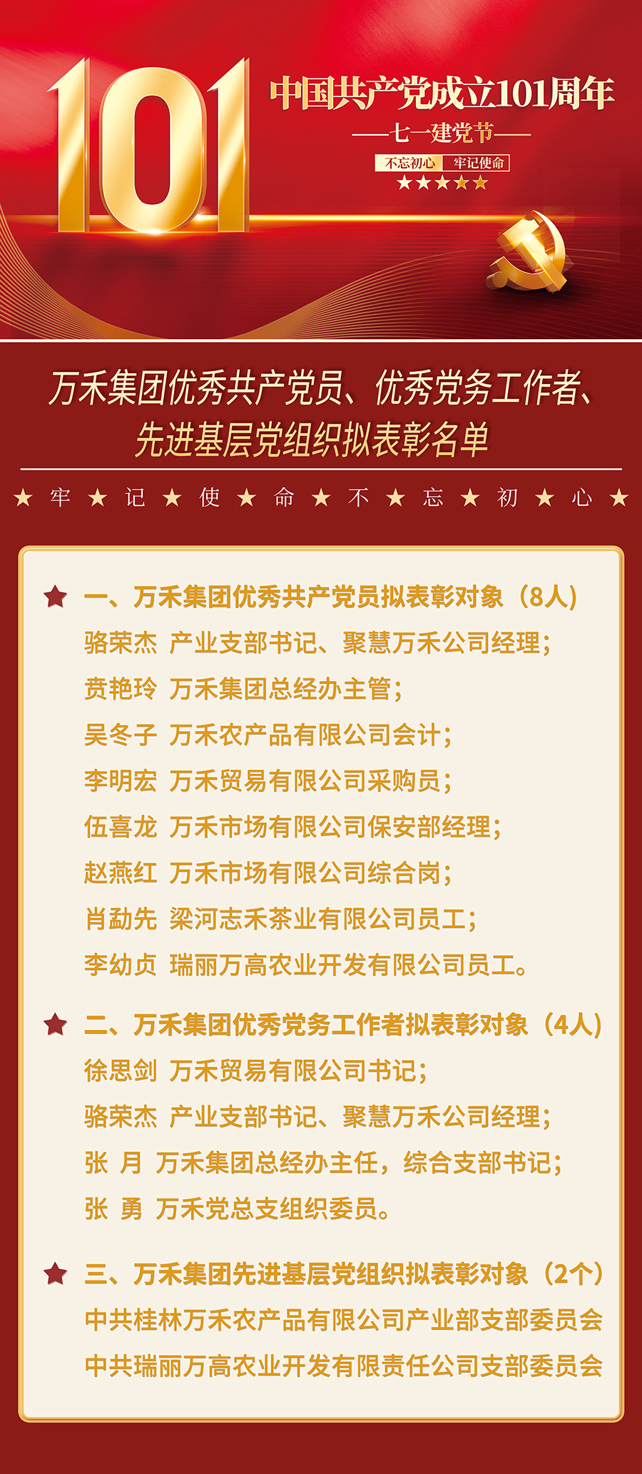 今年是中國共產(chǎn)黨成立101周年。黨總支決定,表彰一批公司優(yōu)秀共產(chǎn)黨員、優(yōu)秀黨務(wù)工作者和先進(jìn)基層黨組織。根據(jù)評選表彰工作部署,在公司各支部提出推薦對象的基礎(chǔ)上,經(jīng)認(rèn)真審核、遴選審議,確定了駱榮杰等8名同志為公司優(yōu)秀共產(chǎn)黨員、徐思劍等4名同志為公司優(yōu)秀黨務(wù)工作者、中共桂林萬禾農(nóng)產(chǎn)品有限公司產(chǎn)業(yè)部支部委員會2個(gè)基層黨組織為公司先進(jìn)基層黨組織擬表彰對象。