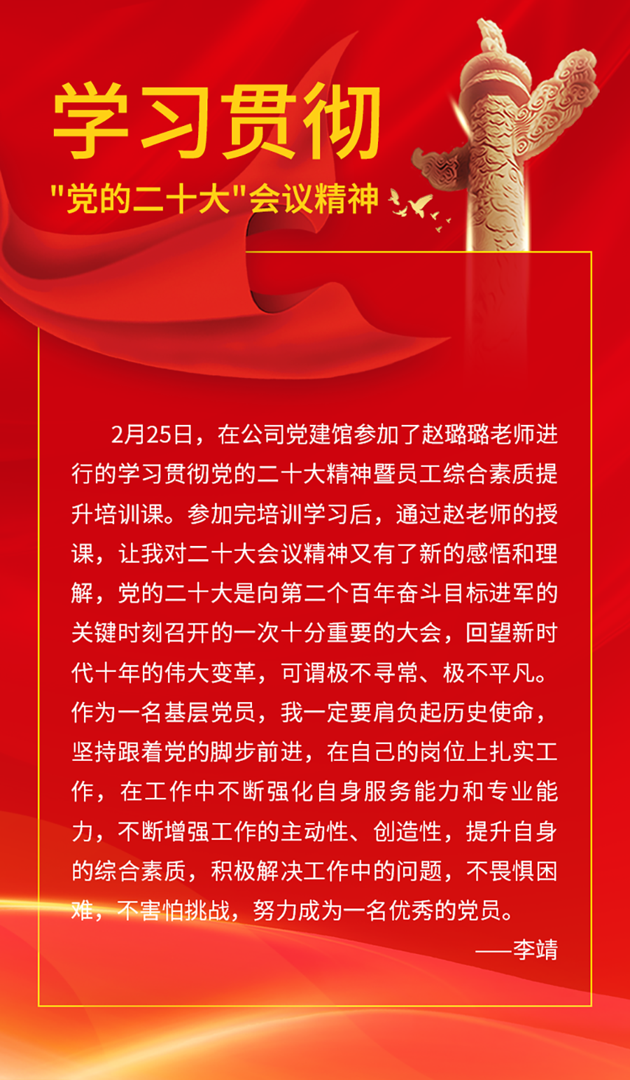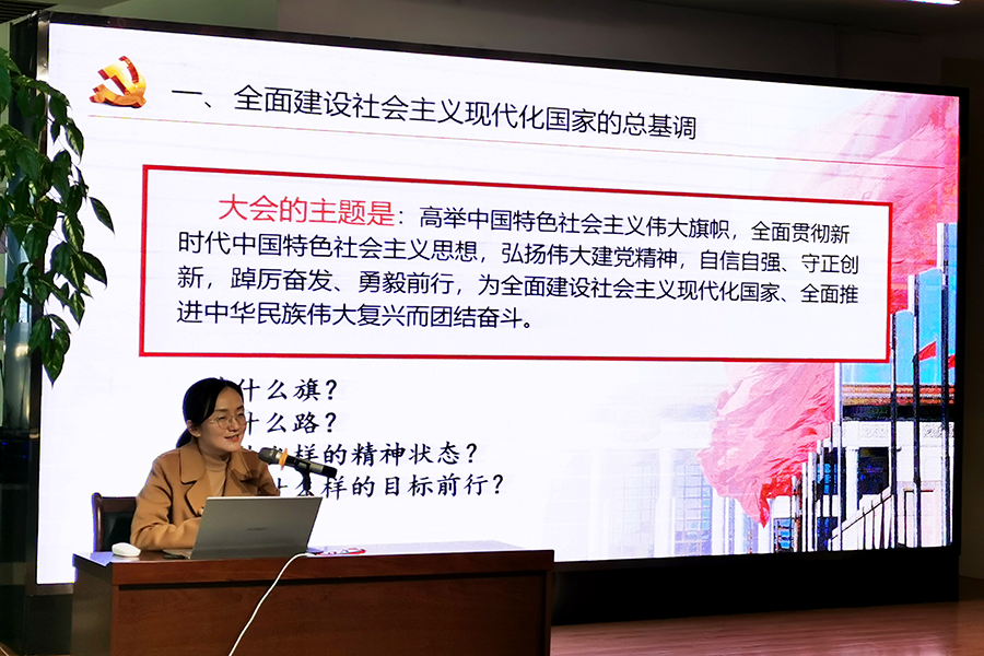 趙璐璐圍繞黨的二十大報(bào)告主要內(nèi)容、全面建設(shè)社會(huì)主義現(xiàn)代化國(guó)家的總基調(diào)、歷史起點(diǎn)、指導(dǎo)思想、奮斗目標(biāo)、戰(zhàn)略部署、全面保障、總動(dòng)員令等8個(gè)方面,對(duì)黨的二十大提出的新思想新論斷、作出的新部署新要求以及如何提升企業(yè)員工綜合素質(zhì)進(jìn)行了案例講解和專(zhuān)題培訓(xùn)。她強(qiáng)調(diào),黨用偉大奮斗創(chuàng)造了百年偉業(yè),也一定能用新的偉大奮斗創(chuàng)造新的偉業(yè)。全黨全軍全國(guó)各族人民要緊密團(tuán)結(jié)在黨中央周?chē)?,牢記空談?wù)`國(guó)、實(shí)干興邦,堅(jiān)定信心、同心同德,埋頭苦干、奮勇前進(jìn),為全面建設(shè)社會(huì)主義現(xiàn)代化國(guó)家、全面推進(jìn)中華民族偉大復(fù)興而團(tuán)結(jié)奮斗!