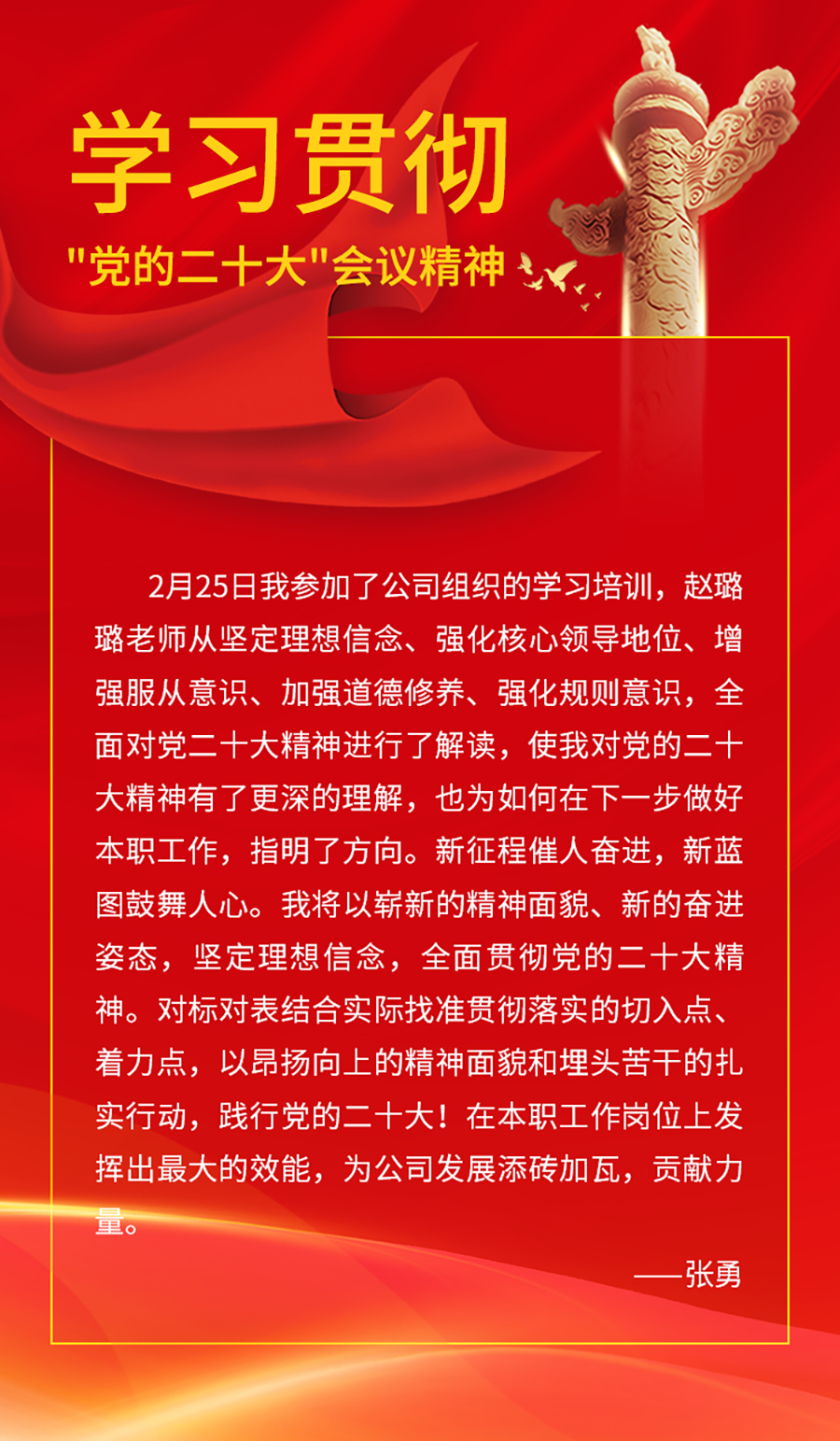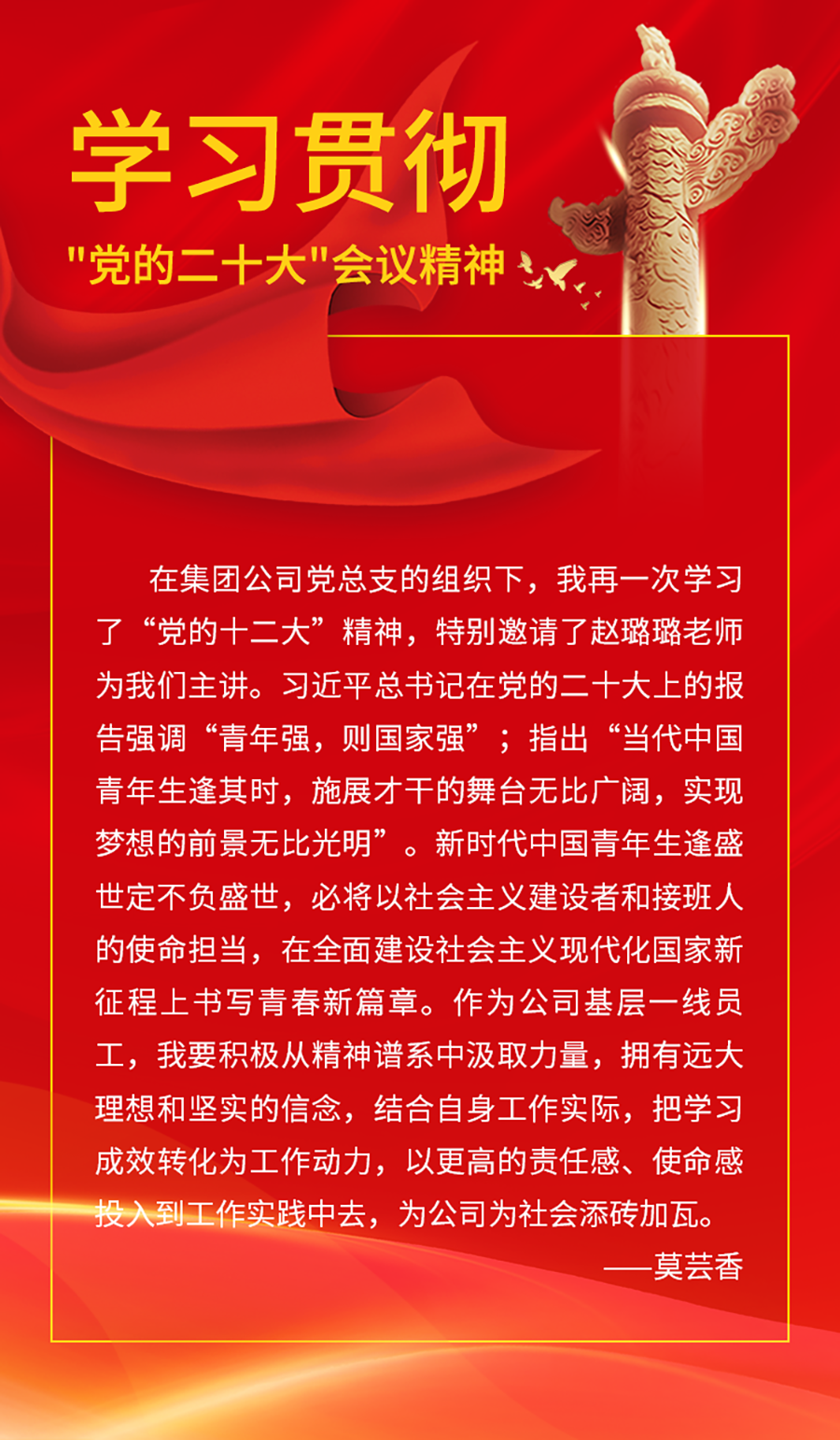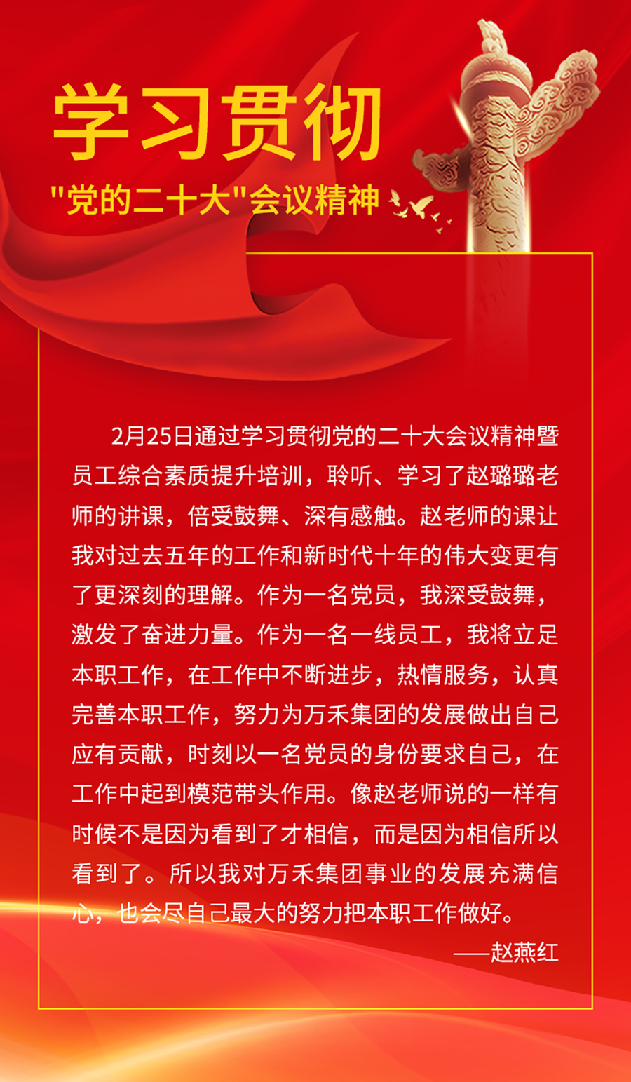 深入學(xué)習(xí)貫徹“黨的二十大”會(huì)議精神,激發(fā)強(qiáng)大奮斗動(dòng)力。萬(wàn)禾集團(tuán)廣大黨員干部學(xué)精神、話(huà)感悟、立新言,奮力把“黨的二十大”會(huì)議精神轉(zhuǎn)化為奮進(jìn)新征程的強(qiáng)大動(dòng)能。
