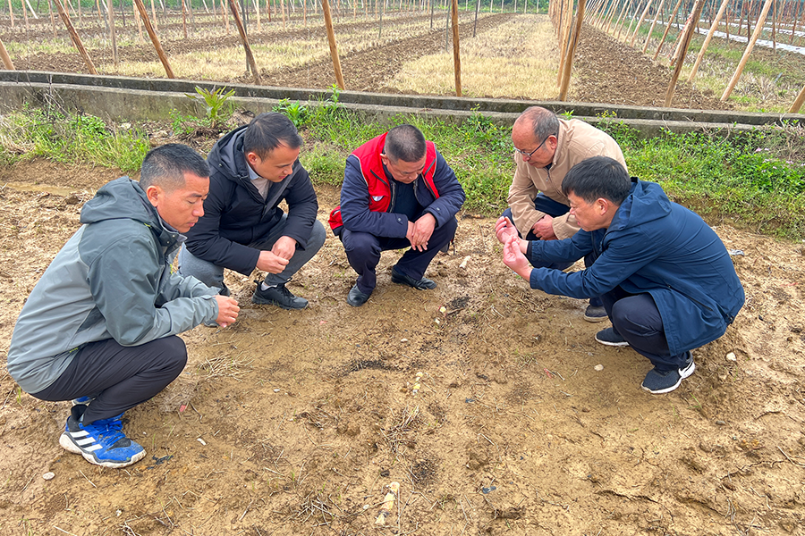 李家文一行認真聽取產(chǎn)業(yè)部支部書記駱榮杰關于基地受災和災后恢復生產(chǎn)情況匯報,對基地開展的防災搶險以及災后恢復生產(chǎn)工作給予了充分肯定。查看已經(jīng)出苗的青皮甘蔗種莖受害情況,并進行現(xiàn)場指導:青皮甘蔗種莖下種后及時蓋上地膜可以保溫增濕,促進青皮甘蔗齊苗。同時指出,未來幾天還會出現(xiàn)強對流天氣,要抓緊時間蓋好地膜,降低損失。后期要注意檢查青皮甘蔗苗受凍情況,發(fā)現(xiàn)缺苗及時補種。