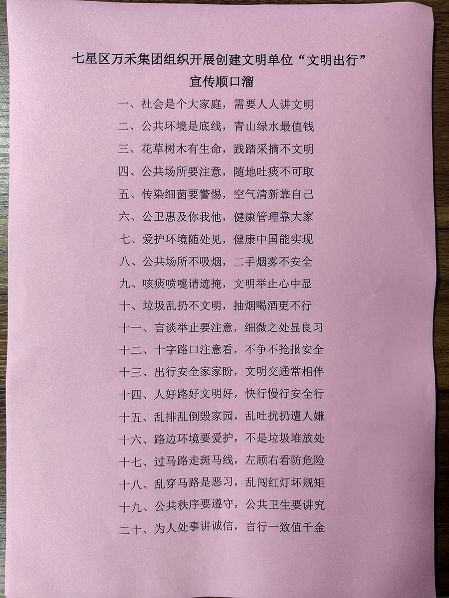 開展此次活動,共計發(fā)放“文明出行”順口溜宣傳單80余份,切實提高了廣大市民對環(huán)境衛(wèi)生的愛護意識,號召大家文明出行從我做起,從身邊的小事做起,鼓勵大家做文明出行的傳播者,為鞏固提升全國文明城市成果貢獻自己的一份力量。
