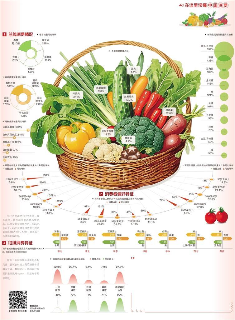 從線上消費(fèi)數(shù)據(jù)看,春筍、豌豆尖、油菜薹、香椿芽、蘆筍等品類的成交額同比增長表現(xiàn)亮眼,為消費(fèi)者餐桌增添更多春天味道。以有機(jī)為標(biāo)簽的高品質(zhì)蔬菜俏銷市場,有機(jī)芹菜、有機(jī)娃娃菜、有機(jī)白蘿卜等銷量實現(xiàn)多倍增長,消費(fèi)者吃得更加健康放心。同時,消費(fèi)者對高品質(zhì)地標(biāo)蔬菜的需求也愈加強(qiáng)烈,云南小黃姜、山東貝貝南瓜、恩施小土豆、山東煙薯、蘭州百合等地標(biāo)蔬菜走向全國各地市場。