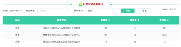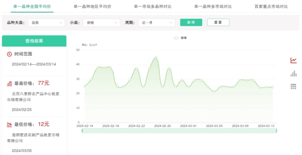 2024年2月14日至3月14日期間全國農(nóng)產(chǎn)品批發(fā)市場(chǎng)香椿平均價(jià)格。截圖自全國農(nóng)產(chǎn)品批發(fā)市場(chǎng)價(jià)格信息系統(tǒng)